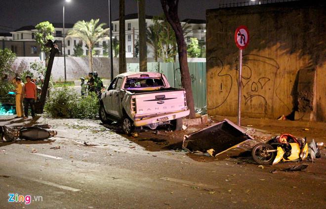 Tại hiện trường, chiếc ôtô bán tải hư hỏng nặng, nhiều mảnh vỡ văng tung tóe, 4 chiếc xe máy nằm la liệt trên đường.
