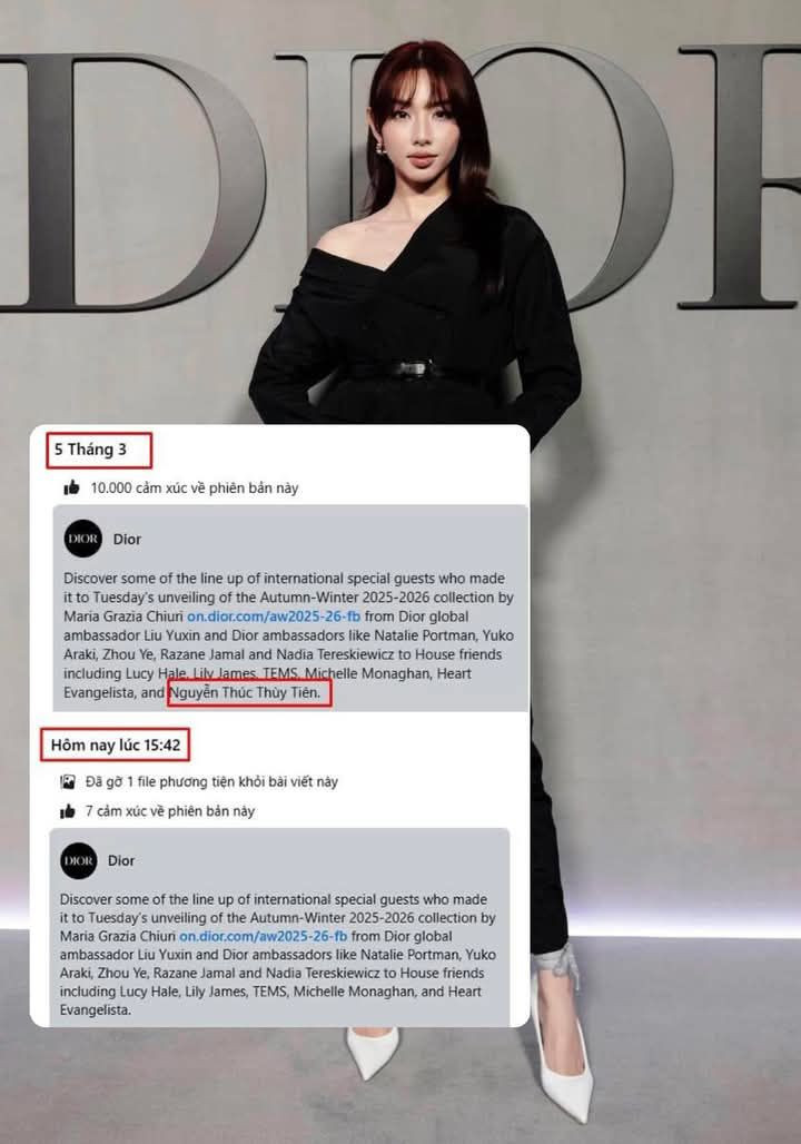 Không chỉ cho hiển thị lại ảnh, một số khán giả tinh mắt còn phát hiện bài đăng trên Instagram của nhà mốt Pháp với hơn 46,8 triệu lượt theo dõi đã khôi phục phần gắn thẻ tên Thùy Tiên kèm danh xưng "Friend of the House" (Bạn thân thương hiệu), dù không còn bất kỳ hình ảnh nào của cô được đăng tải.