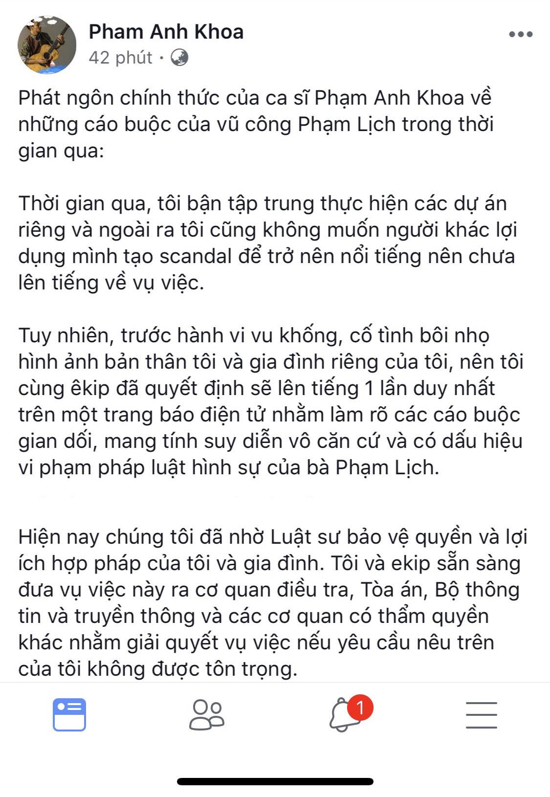Trước những lời tố cáo một chiều từ vũ công Phạm Lịch, nam ca sĩ Phạm Anh Khoa đã có những lời lẽ rất đanh thép đáp trả. Cụ thể, nam ca sĩ Ngựa ô thương nhớ cho biết lý do đến thời điểm này mới lên tiếng vì thời gian vừa qua, anh bận tập trung thực hiện các dự án riêng và anh không muốn người khác lợi dụng scandal để trở nên nổi tiếng.