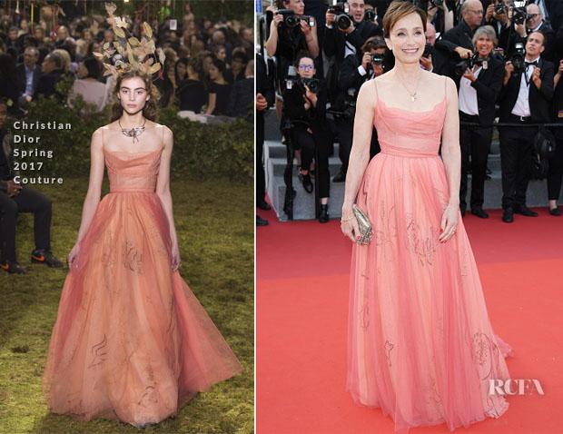 Kristin Scott Thomas diện váy hồng nhẹ nhàng của nhà mốt Christian Dior tại ngày diễn ra sự kiện đặc biệt kỉ niệm 70 năm LHP Cannes được tổ chức.
