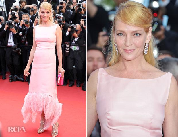 Xuất hiện trên thảm đỏ liên hoan phim Cannes 2017, Uma Thurman diện thiết kế váy màu hồng pastel của thương hiệu Prada. Chiếc váy với chi tiết nhấn nhá ở phần đuôi váy với lông vũ tạo kiểu dáng ấn tượng được cách tân so với chiếc đầm từng được nữ diễn viên Anne Hathaway diện trong lễ trao giải Oscar năm 2013.