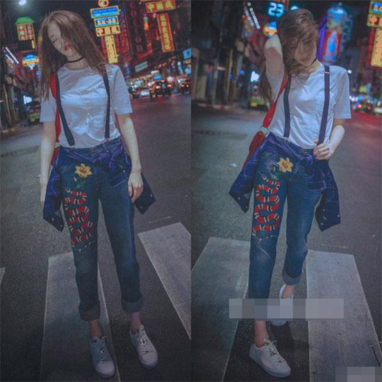 Ở một set đồ khác, Nghê Ni mặc quần jeans họa tiết ngộ nghĩnh con rắn, hoa lá nằm