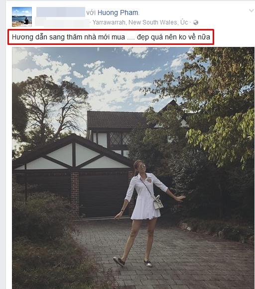 Sở dĩ có nghi vấn này bởi trước đó, một người bạn Hoa hậu đăng tải hình ảnh Phạm Hương đang tung tăng khám phá Australia: "Hương dẫn sang thăm nhà mới mua.... Đẹp quá nên không về nữa". Ngay sau trạng thái của người bạn, nhiều thắc mắc của người hâm mộ được gửi tới: "Bee mua nhà ở đó rồi hả...?", hay: "Chị bỏ tụi em đi thiệt hả? Mua ở Việt Nam đi đâu chi xa xôi, rồi mai mốt tìm chị nơi đâu... Không chịu đâu, em khóc một dòng sông. Bee về với em đi"....