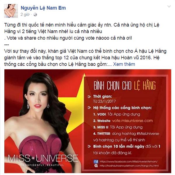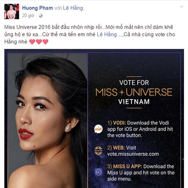 Hoa hậu Phạm Hương vừa mổ mắt, tuy nhiên cô vẫn theo dõi Lệ Hằng từ xa và kêu gọi fan