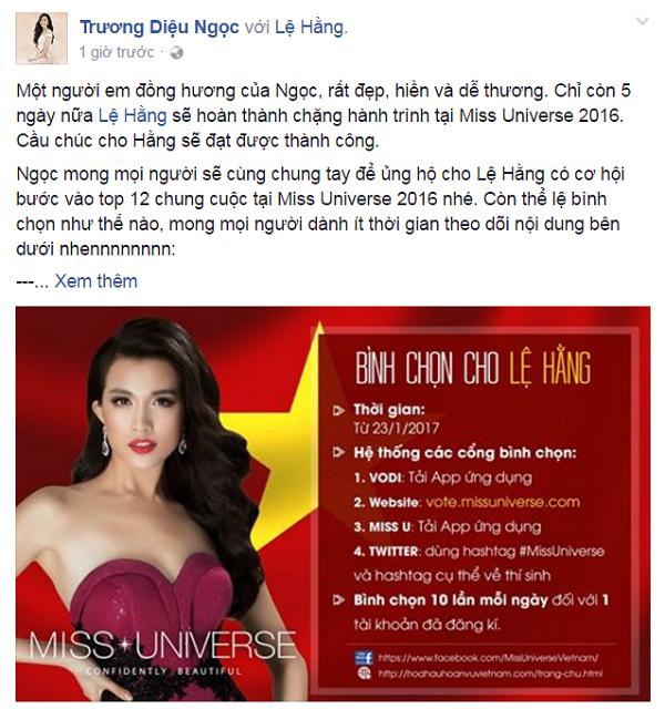 Hoa hậu Đặng Thu Thảo vận động mọi người góp sức bình chọn cho Lệ Hằng.
