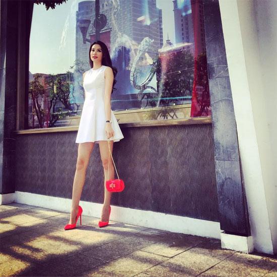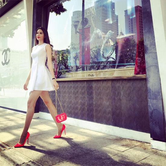 Trong hình ảnh dạo phố mới nhất, Phạm Hương gây chú ý với bộ phụ kiện hàng hiệu đẳng cấp. Chiếc túi đinh tán màu hồng, giày đinh tán đỏ đều của hiệu Christian Louboutin. Cô sử dụng để làm điểm nhấn trên nền chiếc váy màu trắng tinh khôi. Tổng trị giá hai món phụ kiện này khoảng 55 triệu đồng.