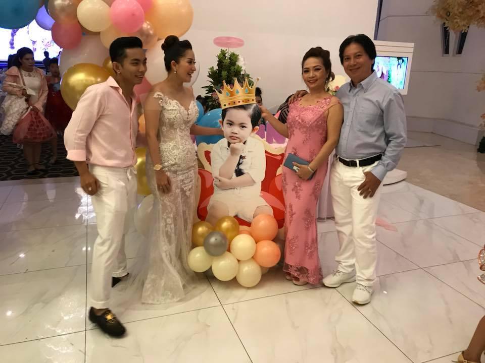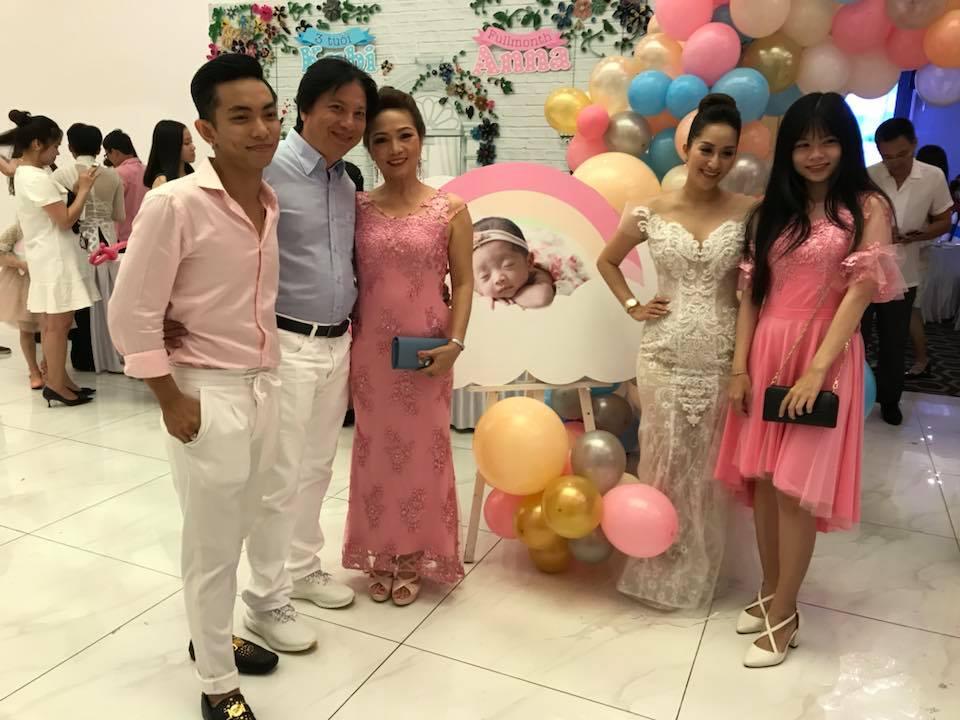 Vợ chồng Khánh Thi và Phan Hiển ghi lại ảnh kỷ niệm bên gia đình chồng trong tiệc đầy tháng con gái và sinh nhật con trai.
