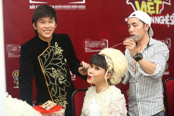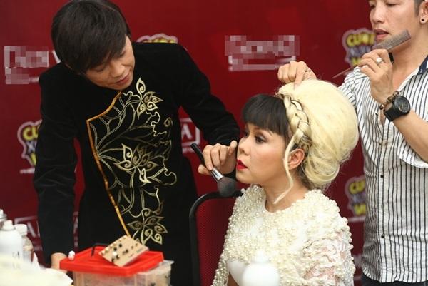 Hoài Linh tự tay trang điểm cho “bà xã màn ảnh”.
