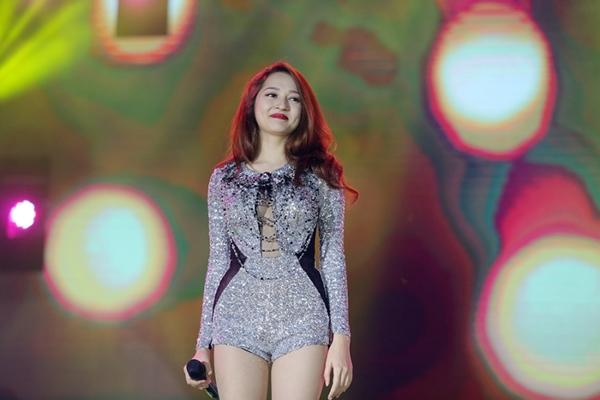 Bảo Anh đầy lôi cuốn, quyến rũ với jumpsuit ánh kim nổi bật khoe chân thon và vòng 1 căng tròn. Nụ cười rạng rỡ và vẻ đẹp của nữ ca sĩ “The Remix” khiến khán giả phát cuồng.