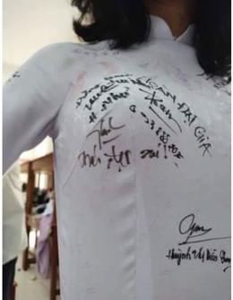 Nữ sinh mặc áo dài trắng đứng để một người bạn ký tên lên áo. Nhưng điểm khiến người xem sốc nặng chính là việc cô bạn để nam sinh cùng lớp ký trực tiếp lên ngực trái.