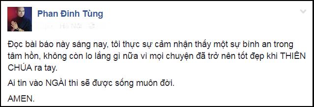 Giữa tâm bão chèn ép đàn em, Phan Đinh Tùng đăng tải một status đầy ẩn ý trên mạng xã hội. "Đọc bài báo này sáng nay, tôi thực sự cảm nhận thấy một sự bình an trong tâm hồn, không còn lo lắng gì nữa vì mọi chuyện đã trở nên tốt đẹp khi thiên chúa ra tay. Ai tin vào ngài thì sẽ được sống muôn đời", anh viết.