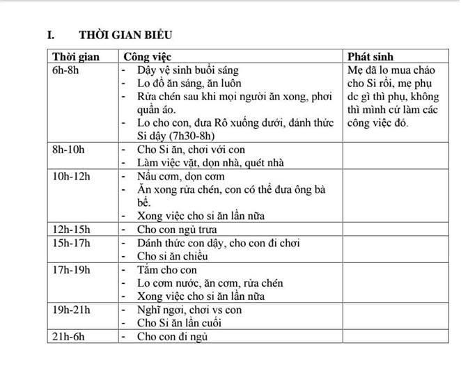 Theo đó, bà mẹ trẻ này sống chung với bố mẹ chồng. Tuy không phải đi làm ngoài nhưng theo thời gian biểu này, người vợ không hề có phút nghỉ ngơi cũng như thời gian cho bản thân mình từ 6 giờ sáng cho tới 9 giờ tối. Toàn bộ thời gian trong ngày của cô vợ đã được chồng xếp kín với các công việc nhà và chăm sóc cho 2 con nhỏ.