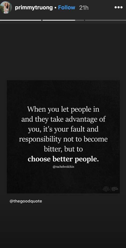 Theo đó, cô đã đăng trên Instagram Story: "When you let people in and they take advantage of you, it's your fault and responsibility not to become bitter, but to choose better people (tạm dịch: Khi mà bạn tin tưởng ai đó và bị họ lợi dụng, đó là lỗi của bạn. Việc bạn cần làm không phải là oán trách mà hãy chọn một người tốt hơn)".