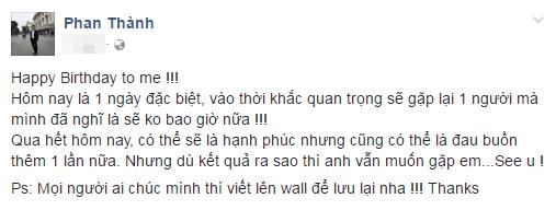 "Happy Birthday to me!!! Hôm nay là một ngày đặc biệt. Vào thời khắc quan trọng tôi sẽ gặp lại một người mà tôi nghĩ là sẽ không bao giờ gặp nữa. Qua hết hôm nay, có thể sẽ là hạnh phúc nhưng cũng có thể là đau buồn. Nhưng dù kết quả ra sao thì anh vẫn muốn gặp em...See u!", Phan Thành úp mở.