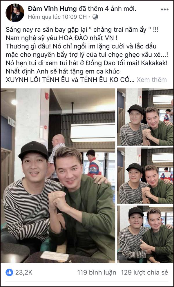 Mr Đàm nhắn rằng, anh sẽ hát hai ca khúc Xin lỗi tình yêu và Tình yêu không có lỗi để dành tặng Trường Giang. Hiện, chia sẻ mới nhất của Đàm Vĩnh Hưng đã hút hơn 23 ngàn lượt thích và hơn 100 lượt chia sẻ từ cộng đồng mạng.