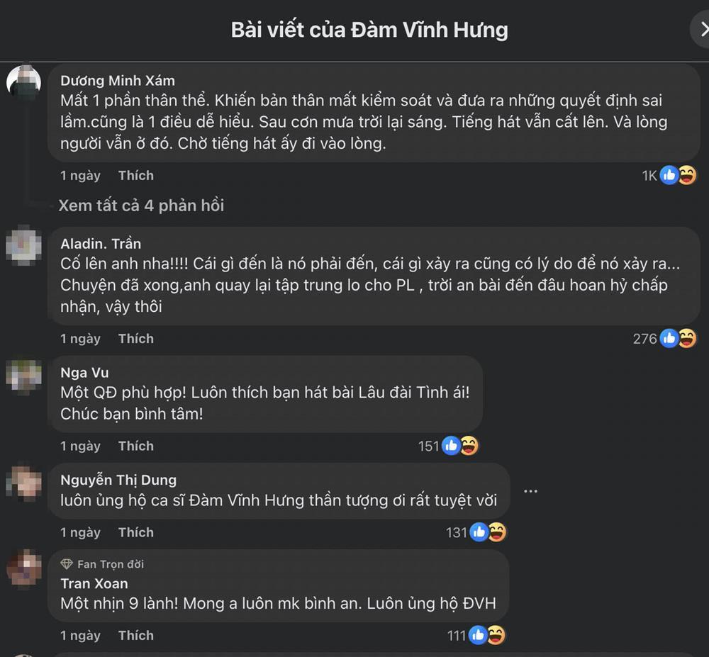 "Mất 1 phần thân thể khiến bản thân mất kiểm soát và đưa ra những quyết định sai lầm cũng là điều dễ hiểu. Sau cơn mưa trời lại sáng. Tiếng hát vẫn cất lên và lòng người vẫn ở đó. Chờ tiếng hát ấy đi vào lòng"; "Cố lên anh nha! Cái gì đến phải đến, cái gì xảy ra cũng có lý do để nó xảy ra"; "Chuyện đã xong, anh quay lại tập trung lo cho PL, trời an bài đến đâu hoan hỷ chấp nhận, vậy thôi"; "Một quyết định phù hợp! Luôn thích bạn hát bài 'Lâu đài tình ái!' Chúc bạn bình tâm!";... một số ý kiến an ủi trên trang cá nhân Đàm Vĩnh Hưng.
