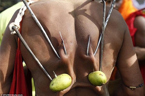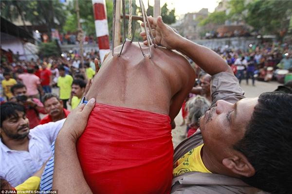Các thầy tư tế có khả năng xiên móc vào lưng những người tham gia mà hầu như không gây trầy xước hay thương tích gì. (Ảnh: Zakir Hossain)