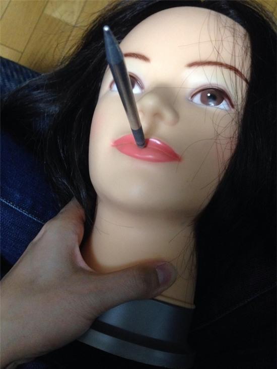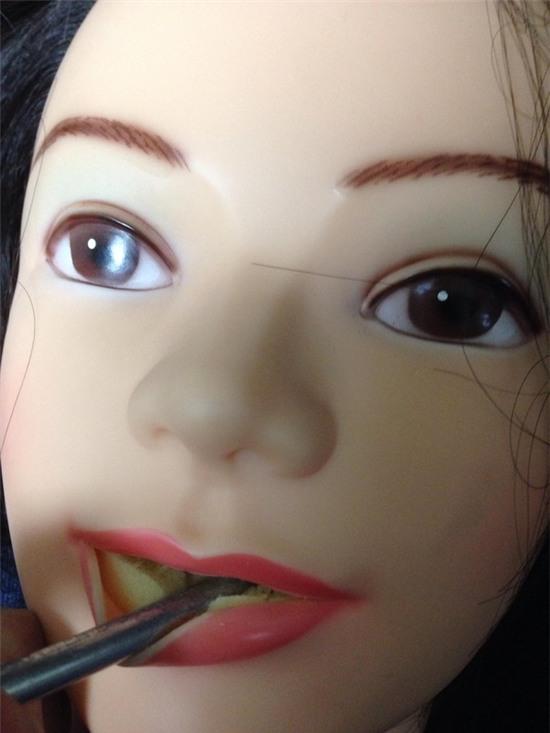 Anh chàng "táy máy" bắt đầu rất ngọt khi cắm bút vào miệng búp bê để bắt đầu rạch. (Ảnh: Internet)
