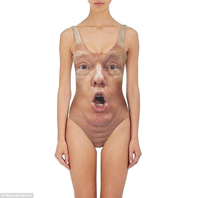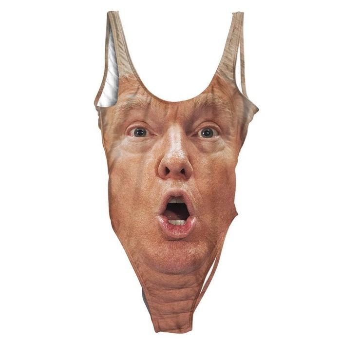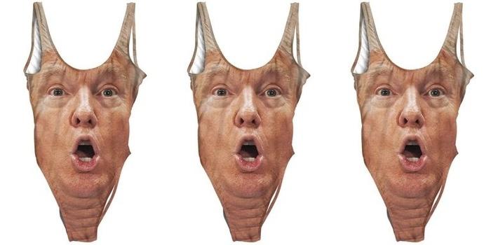 Áo tắm này mô phỏng hình khuôn mặt hoảng hốt, miệng há hốc, mắt trợn tròn của Tổng thống Mỹ Donald Trump.