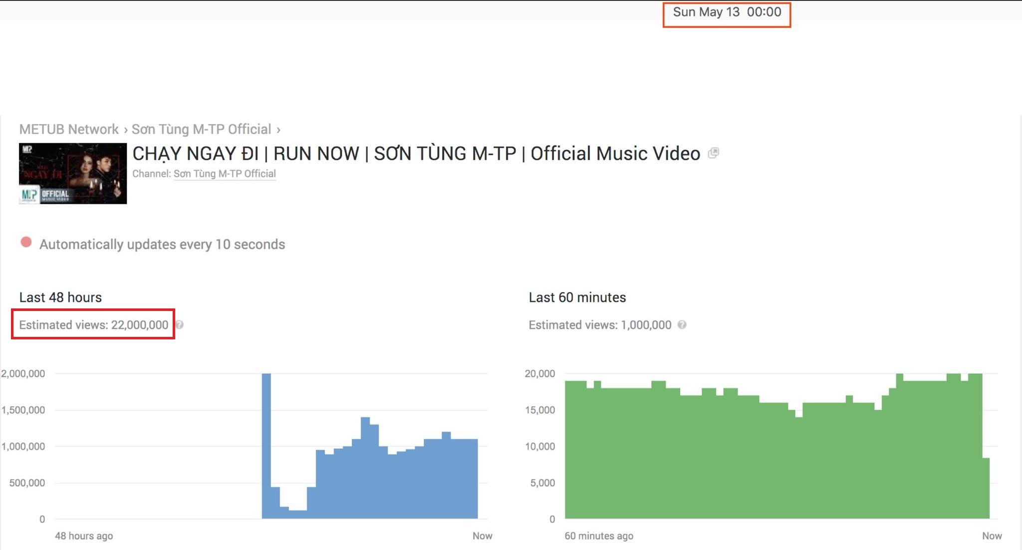 Báo cáo lượt xem thời gian thực ghi nhận vào lúc 0h ngày 13/5/2018, Chạy ngay đi đã đạt 22 triệu lượt xem. (Nguồn: YouTube Analytics - Kênh YouTube Sơn Tùng M-TP Official)