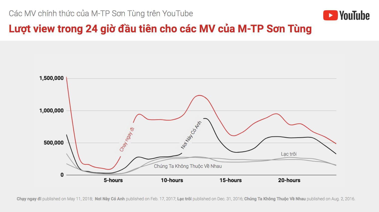 Thống kê về lượt xem của các MV Chạy ngay đi, Nơi này có anh, Lạc trôi (Nguồn: Trang blog tiếng Việt chính thức của Google).