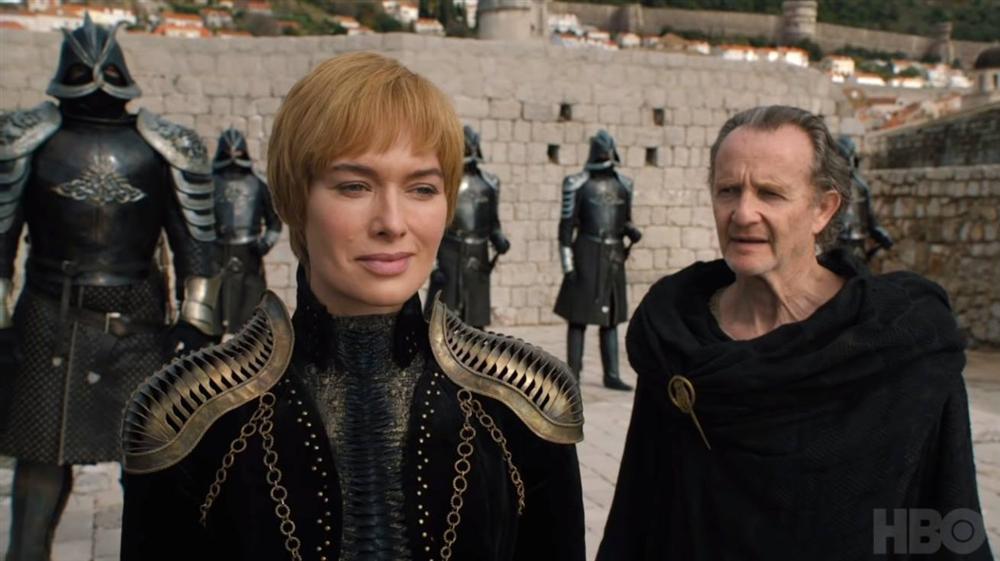 Nữ hoàng Cersei Lannister và quân sư Qyburn đứng trên đỉnh tường thành nhìn ra biển, chờ thuyền cập bến.