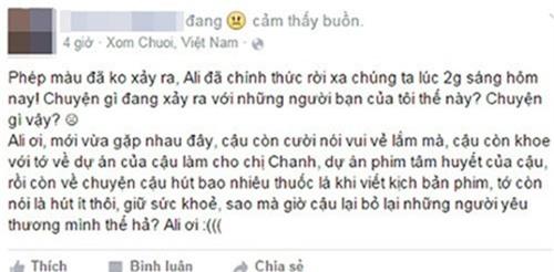 Tuy nhiên, rạng sáng 8/3, Ali Hùng Cường đã không qua khỏi và mãi mãi ra đi ở tuổi 30. Việc phó đạo diễn tài năng bất ngờ qua đời khiên nhiều bạn bè, đồng nghiệp - những người từng tiếp xúc với anh đều thất thần, không tin đây là sự thực.