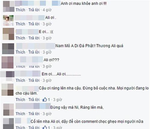 Ở phần bình luận bên dưới đoạn trạng thái này, một người bạn thân thiết khác của Ali Hùng Cường cập nhật, vào lúc 23h30 ngày 7/3, phó đạo diễn điển trai lịm dần và tưởng như đã ra đi vĩnh viễn. Thế nhưng, sau khoảng 10 phút, anh bắt đầu cử động mấy ngón tay trở lại. Sau đoạn status trên, rất nhiều bạn bè và đồng nghiệp đã ra sức gọi anh tỉnh dậy trên mạng xã hội: “Anh ơi, mau khỏe anh ơi”, “Cậu ơi, ráng lên nhe cậu, Đừng bỏ cuộc nhe. Mọi người đang lo cho cậu lắm”, “Cố lên Ali ơi, dậy để còn comment chọc ghẹo mọi người nữa”, “Dậy đi, còn phải viết xong cái kịch bản phim cho chị nè”…