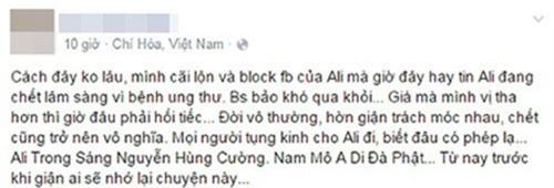 Tối 7/3, thông qua trang cá nhân, người bạn của phó đạo diễn Ali Hùng Cường (hay thường gọi là: Ali trong sáng, tên thật Nguyễn Hùng Cường) bất ngờ thông báo tin dữ rằng anh đang chết lâm sàng vì ung thư và khả năng sống hiện rất thấp. Người này viết: “Cách đây không lâu, mình cãi lộn và chặn Facebook của Ali mà giờ đây hay tin Ali đang chết lâm sàng vì bệnh ung thư. Bác sĩ bảo khó qua khỏi. Giá mà mình vị tha hơn thì giờ đâu phải hối tiếc. Đời vô thường, hờn giận trách móc nhau, chết cũng trở nên vô nghĩa. Mọi người tụng kinh cho Ali đi, biết đâu có phép lạ. Ali trong sáng Nguyễn Hùng Cường…”.