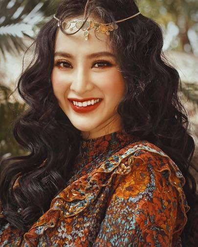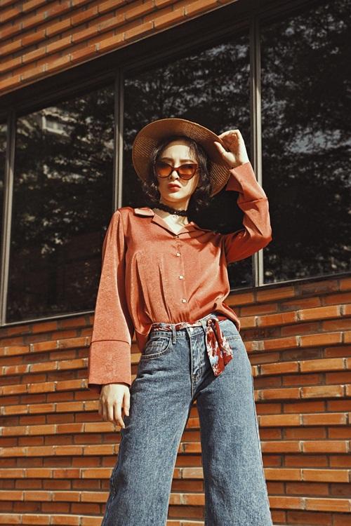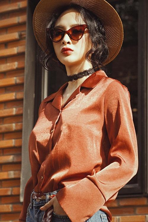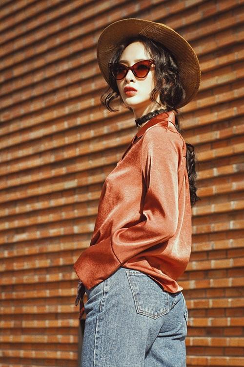 Angela Phương Trinh còn hoá thân thành nữ cao bồi miền Tây nước Mỹ với áo sơ mi gam nâu, chất liệu quyến rũ, cùng quần jean ống loe. Chiếc vòng cổ choker tatoo được điểm xuyết tinh tế càng tôn lên vẻ cá tính của cô nàng.