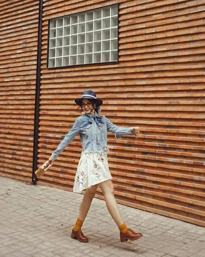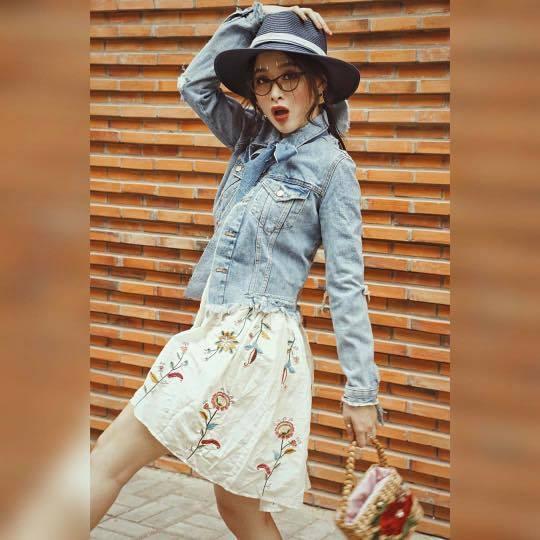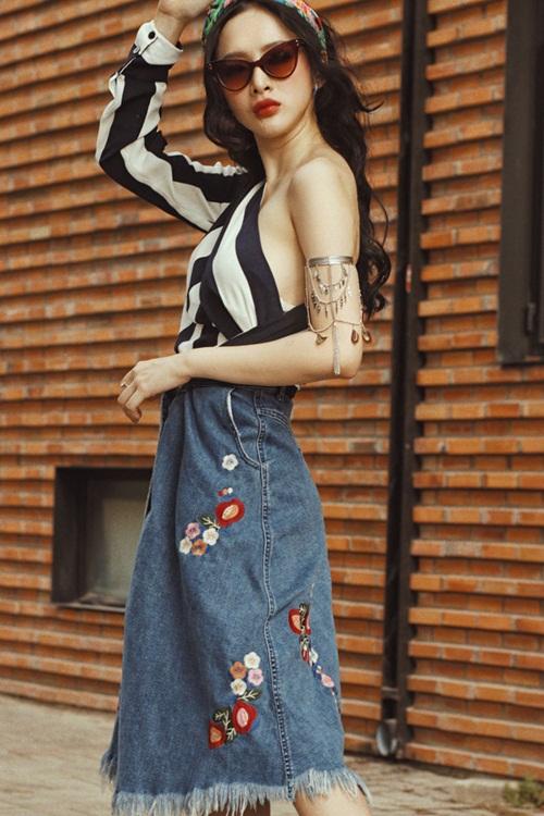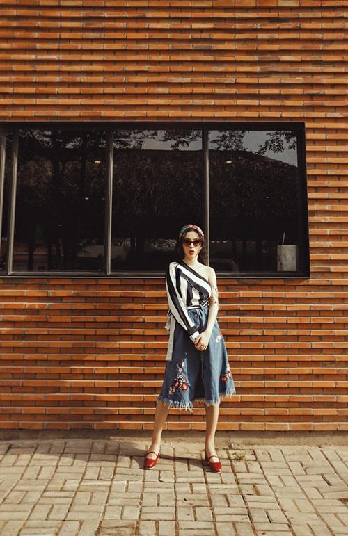 Không đóng khung mình với hình ảnh nữ tính quyến rũ, nữ diễn viên táo bạo phá cách áo sơ mi cắt một bên tay kết hợp cùng chân váy jean họa tiết thêu hoa. Bên cạnh đó là phụ kiện mix khá cá tính: Khăn tuban và vòng tay tua rua.