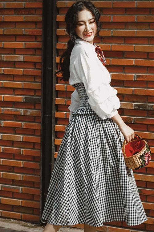Bên cạnh đó, Angela Phương Trinh còn khéo léo biến hình biểu lộ nét nữ tính trong chiếc áo sơ mi trắng cách điệu, tay xếp tầng cùng chân váy caro.