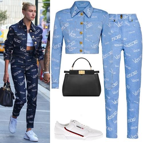 Hailey Baldwin khi đi chơi cùng Justin Bieber cuối tuần qua ở NYC. Áo jacket chất liệu denim Logomania gần 32 triệu đồng và quần jean cạp cao Logomania gần 29 triệu đồng của Versace, túi Fendi Peekaboo Mini "nhẹ nhàng" 78 triệu đồng và giày Adidas Originals Continental 1,8 triệu đồng.