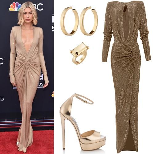 Hailey Baldwin mặc váy cổ chữ V của Alexandre Vauthier (161,9 triệu đồng), nhẫn Emerald Cut Gem Ring và khuyên tai (gần 15 triệu đồng) đều của Jennifer Fisher, đôi sandal Jimmy Choo (10,6 triệu đồng) tại lễ trao giải Billboard Music Awards 2018 ở MGM Grand Garden Arena (Las Vegas)