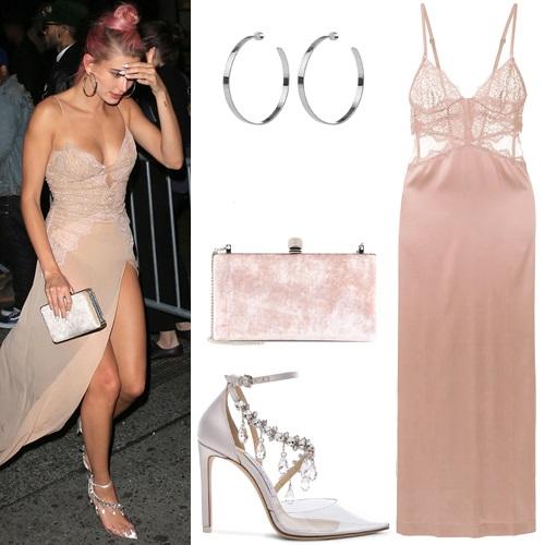 Hailey Baldwin rời buổi tiệc hậu Met Gala ở CLB Up and Down. Khoan nói đến bộ váy, riêng clutch nhung cầm tay Jimmy Choo đã là 26,4 triệu đồng, đôi khuyên tai Jennifer Fisher giá 8,4 triệu đồng và giày "tông xuyệt tông" với clutch luôn là Jimmy Choo x Off-White giá 27,5 triệu đồng