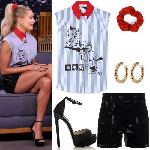 Hailey Baldwin xuất hiện trong chương trình The Tonight Show Starring Jimmy Fallon vài ngày trước trong bộ đồ gồm áo kẻ cổ đỏ in hình (21,1 triệu đồng), quần short bò (22,8 triệu đồng) đều của Prada, lại một lần nữa là khuyên tai của Jennifer Fisher (21,8 triệu đồng), dây buộc tóc Princess Polly (345.000 đồng 3 cái) và sandal Jimmy Choo (gần 23 triệu đồng).