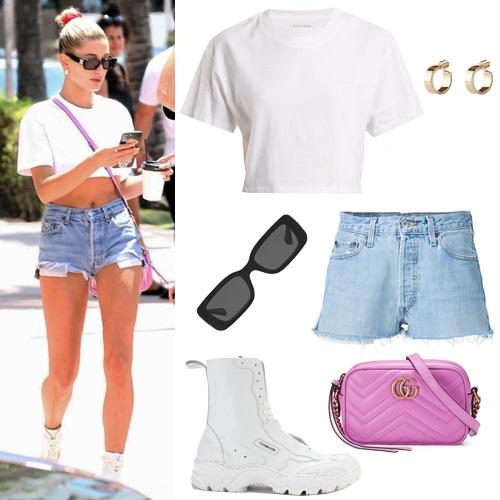 Khi đi mua sắm, Hailey Baldwin mặc áo phông trơn của Hanes x Karla (1,1 triệu đồng), quần short Re/Done (hơn 4 triệu đồng), túi Gucci Marmont (22,5 triệu đồng), kính râm Off-White x Sunglasses Hut (hơn 5 triệu đồng), lại tiếp tục khuyên tai Jennifer Fisher (4 triệu đồng) và boot của Rombaut (8,6 triệu đồng).