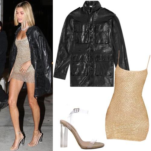 Sinh nhật bạn là phải lên đồ! Hailey Baldwin đến dự sinh nhật lần thứ 23 của Gigi Hadid tại khách sạn the One ở Brooklyn với áo parka bằng da Faith Connexion (48,9 triệu đồng), váy nhũ Oh Polly (1,6 triệu đồng) và đôi sandal quai trong Yeezy Season 2 (gần 15 triệu đồng).