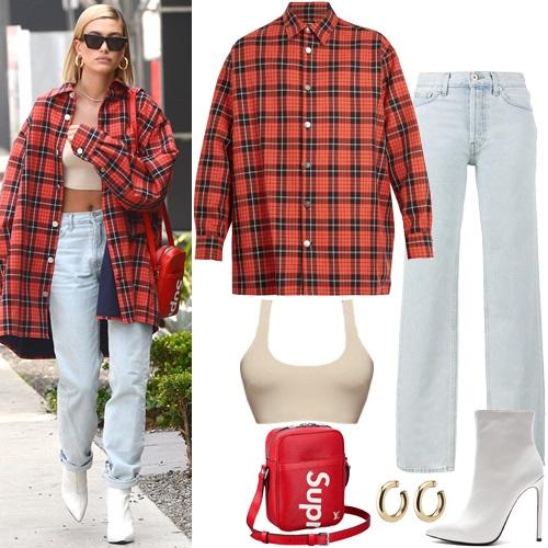 Hailey Baldwin đi dạo ở Hollywood với áo JluxLabel (414.000 đồng), áo khoác Raf Simons (23,5 triệu đồng), quần jean ống đứng Yeezy Season 5 (7,4 triệu đồng), túi đeo vai Supreme x Louis Vuitton (142,7 triệu đồng), kính râm Celine (6,8 triệu đồng), khuyên tai thêm một lần nữa là Jennifer Fisher (10,3 triệu đồng) và đôi bốt Tony Bianco (3,2 triệu đồng).
