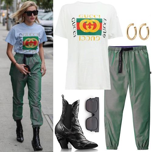 Chỉ là đi uống cafe mà Hailey Baldwin diện luôn áo phông có logo Gucci (12,6 triệu đồng), quần bó ống Columbia X Opening Ceremony (3,6 triệu đồng), kính râm Vera Wang (5,7 triệu đồng), khuyên tai Jennifer Fisher (hơn 8 triệu đồng) và đôi ankle boot của Louis Vuitton (gần 41 triệu đồng).