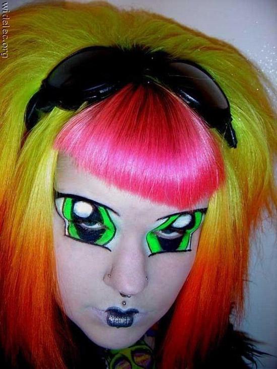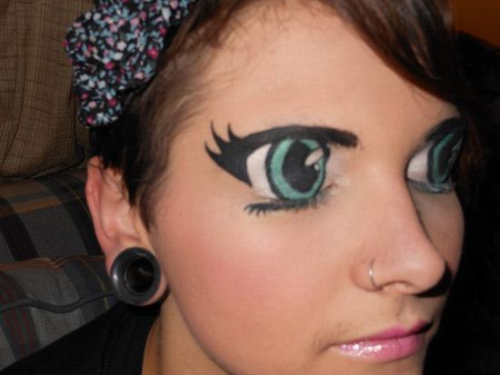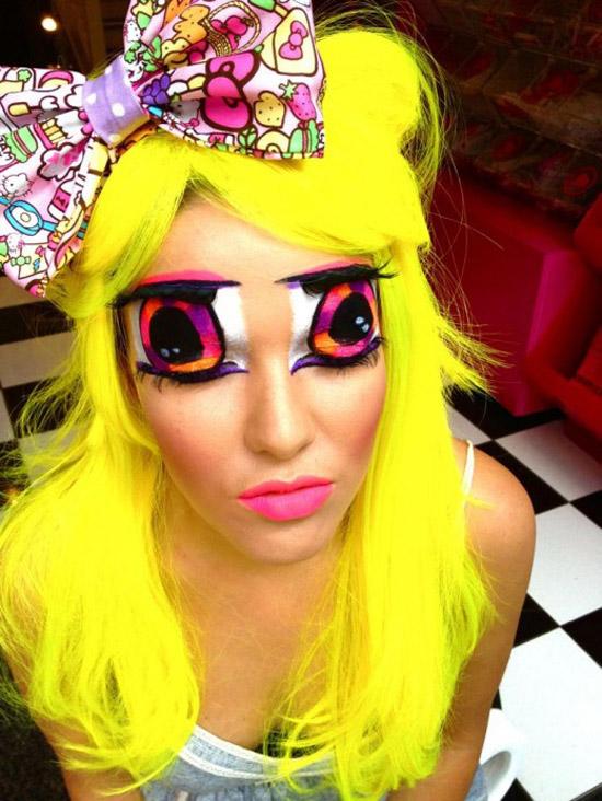 Phong cách điển hình được các tín đồ Anime ưa chuộng nhất đó là vẽ cho đôi mắt thật của mình to hơn so với thực tế. Để có được đôi mắt to hơn, các tín đồ phải nhờ tới lông mi giả loại dày, chì kẻ mắt màu trắng, kính giãn tròng màu, phấn mắt, phấn trang điểm tạo khối và một số công cụ hỗ trợ khác.
