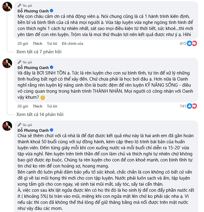 Và đây là bơi sinh tồn ạ. Tức là rèn luyện cho con sự bình tĩnh, tự tin để xử lý những tình huống bất ngờ có thể xảy đến. Chứ chưa phải là học bơi đâu ạ. Hơn nữa là Oanh nghĩ rằng rèn luyện kỹ năng sinh tồn là bước đệm để rèn luyện kỹ năng sống - điều vô cùng quan trọng trong hành trình thành nhân."