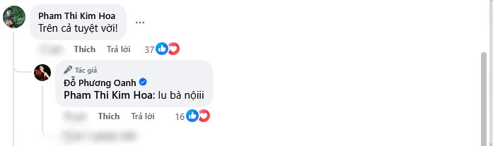 Dưới bài đăng của Phương Oanh, mẹ chồng cô cũng lên tiếng ủng hộ: "Trên cả tuyệt vời!". Nữ diễn viên cũng đáp lại: "Yêu bà nội". Chỉ một câu nói nhưng cũng cho thấy được mối quan hệ thân thiết giữa mẹ chồng và nữ diễn viên.