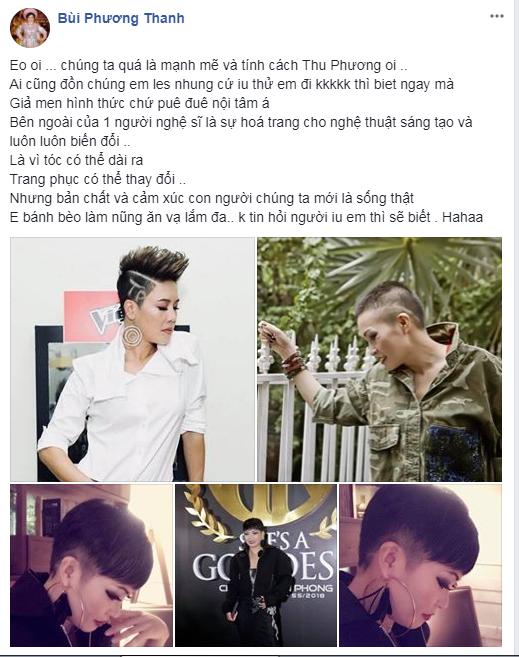 Đính kèm lời chia sẻ là hình ảnh Thu Phương cùng Phương Thanh với mái tóc ngắn cá tính. Dòng trạng thái của chị Chanh nhanh chóng thu hút sự chú ý của cộng đồng mạng. Nhiều người bày tỏ sự thú vị khi cô chia sẻ về chuyện giới tính, đồng thời khẳng định giọng ca xứ Thanh là "bánh bèo chính hiệu".