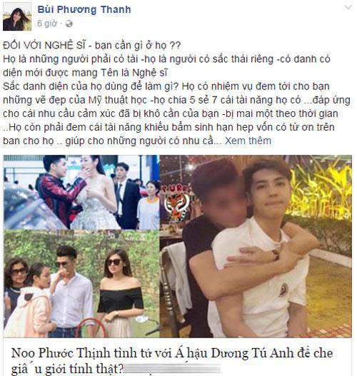 Trước đó không lâu, Phương Thanh bức xúc lên tiếng bảo vệ Noo Phước Thịnh giữa tin đồn yêu Á hậu Tú Anh nhằm che mắt dư luận về giới tính thật. Không những thế, nữ ca sĩ họ Bùi thẳng thắn thừa nhận bản thân là người lưỡng tính.