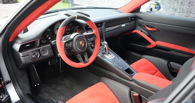 Bên trong Porsche 911 GT2 RS 2018 là nội thất bọc Alcantara màu đỏ và nhiều chi tiết bằng sợi carbon. Ghế được thiết kế ôm sát thân người ngồi và đi kèm lưng ghế bằng sợi carbon. Chưa hết, Porsche 911 GT2 RS 2018 còn có khung roll cage như xe đua.