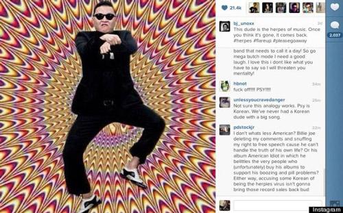 Cả thế giới hào hứng với Psy và những ca khúc vui nhộn của nam ca sĩ Hàn Quốc, nhưng có vẻ như Billie Joe Armstrong của Green Day là một ngoại lệ. Mới đây, Billie này đăng lên Instagram một tấm hình của Psy kèm lời bình luận: "Anh chàng này như căn bệnh mụn rộp (herpes) trong âm nhạc. Khi bạn nghĩ bạn đã khỏi bệnh thì nó lại quay trở lại".