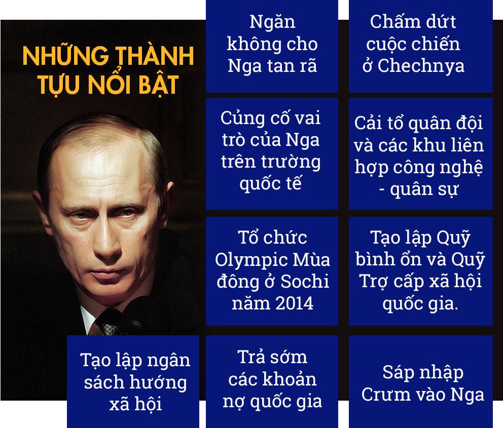 Trong gần 18 năm dưới sự lãnh đạo của Tổng thống Putin, nước Nga lại một lần nữa được gọi tên với sự tôn trọng, Năm 2014, Olympic Sochi đã đánh dấu sự trở lại mạnh mẽ của Nga. Cùng năm, việc sáp nhập Bán đảo Crưm đã làm trào dâng làn sóng yêu nước và tỷ lệ ủng hộ đối với Tổng thống Putin tăng tới gần 90%, theo thăm dò của trung tâm Levada.