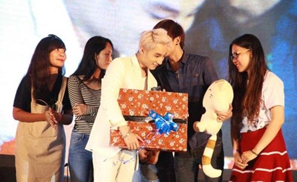 Không chỉ có những dịp đặc biệt như sinh nhật hay tổ chức liveshow, cứ hễ gặp anh là các fan lại... tặng quà. Hầu hết fans của Sơn Tùng đều là những bạn trẻ tuổi và không thể 'chơi trội' như các fansite Hàn Quốc nhưng chỉ với tình cảm chân thành, cũng đủ khiến cho chàng ca sĩ gốc Thái Bình cảm động.