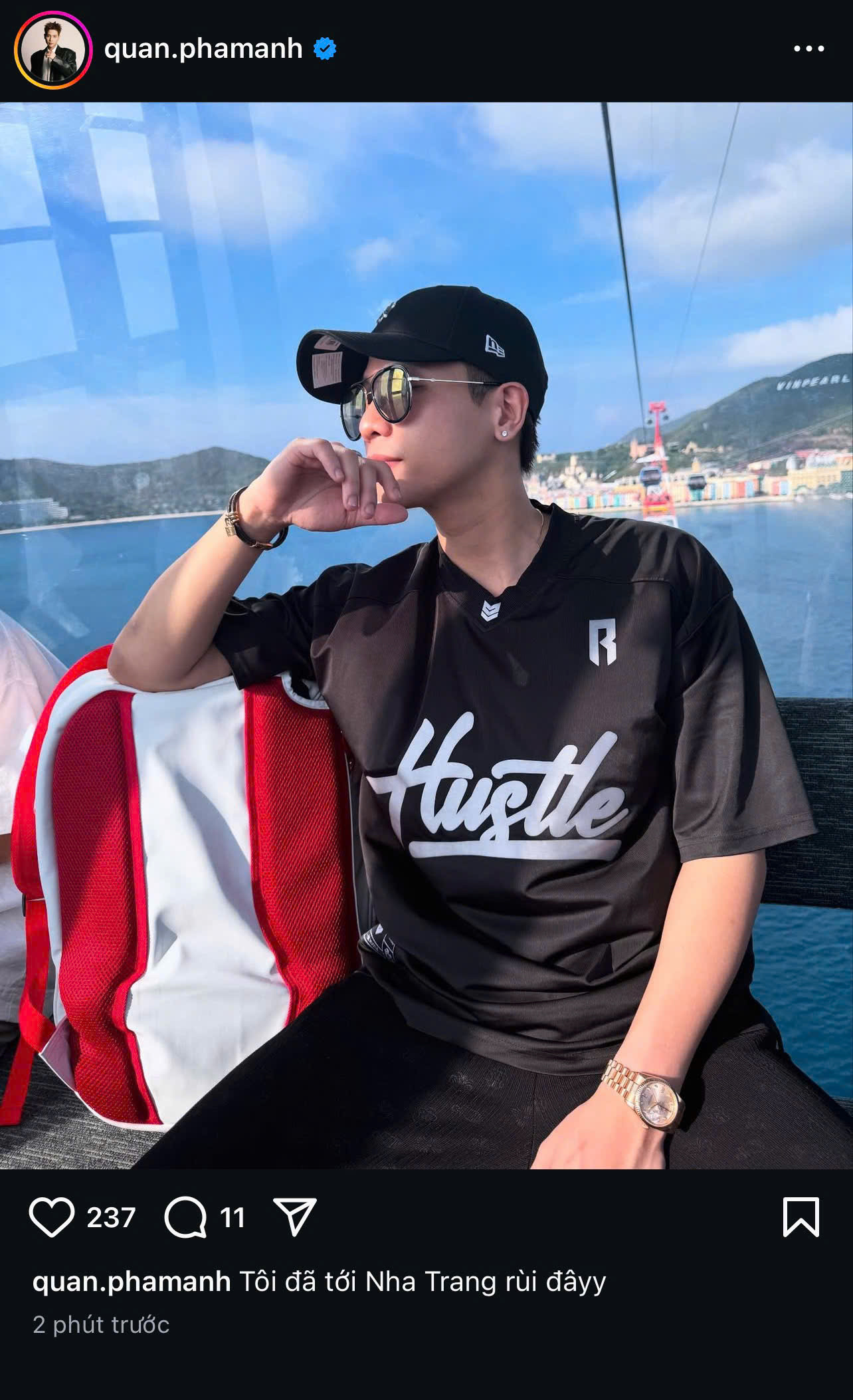Mới đây, ca sĩ Quân A.P tiếp tục gây chú ý khi để lộ hint du lịch chung cùng bà xã "giấu kín". Trên trang cá nhân, ca sĩ sinh năm 1997 chia sẻ hình ảnh trên cáp treo: “Tôi đã tới Nha Trang rồi đây”. Chỉ sau đó ít giờ, Lê Khanh - vợ nam ca sĩ cũng đăng tải bức hình viết dòng chú thích “Nghỉ lễ” cùng "background" là khung cảnh cáp treo trên biển Nha Trang.